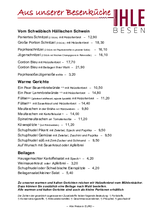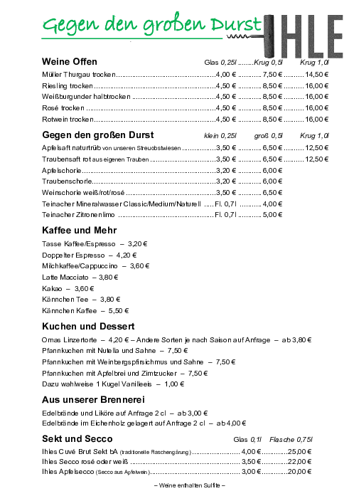 Als Gutsauschank des Weinguts Ihle stehen bei den Getränken natürlich die Ihle-Weine im Vordergrund. Im offenen Ausschank – ob pur oder als Schorle – bieten wir die Basis-Gutsweine und einige ausgewählte Weine. Die ganze Palette der Ihle-Weine, vom Kabinett bis zu den Spezialitäten ist auch als Flaschenwein erhältlich.