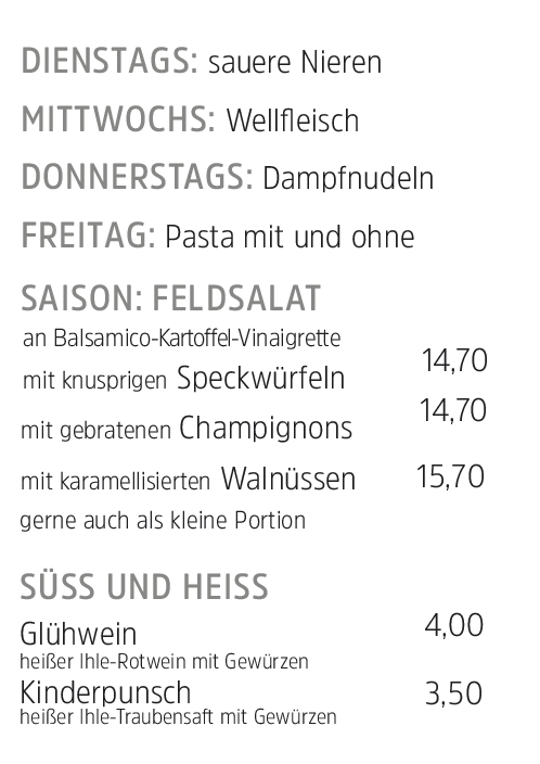 Im Ausschank sind ausschließlich Weine vom Weingut Ihle und über die Sommermonate Klosterbier vom Stift Neuburg, Heidelberg.