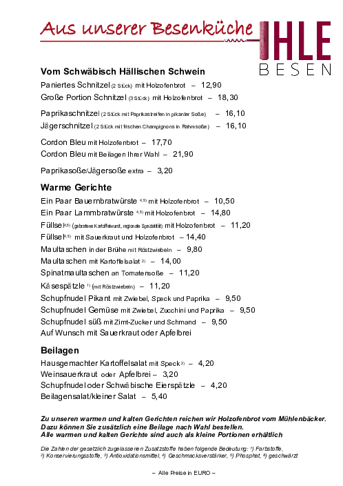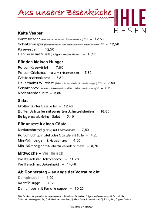 Zu den Weinen bieten wir typische Gerichte einer Besenwirtschaft, einfach aber lecker, etwa Bratwurst (nach eigenem Rezept), Maultaschen, Schupfnudel, Käsespätzel und Vesperteller.